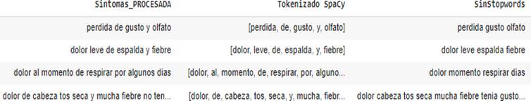 The Stop Word technique allows to extract meaningless words such as articles, pronouns and prepositions that are stored in the Spanish dictionary. Application of SpaCy Lemmatization technique allows retrieving information, reducing the redundancy of words, and generating them to their root form, as well as finding relations between words that do not exist.