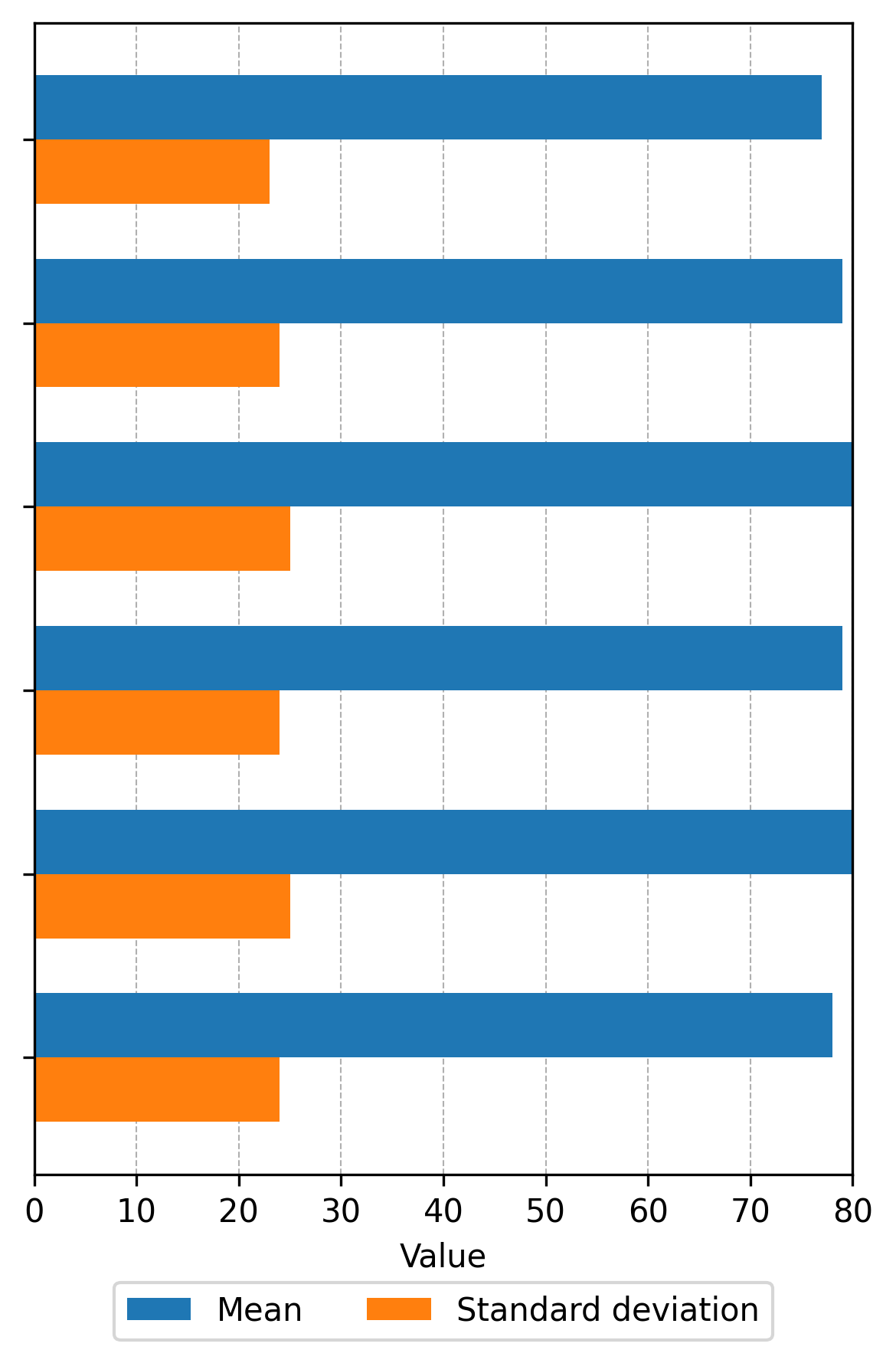 The descriptive statistics (mean and standard deviation) for each of the possible combinations of the different levels of the variables are presented in Figure 1, based on the different levels of the variables: Periods, Batch, Emotion, and Learning Rate, in that order.