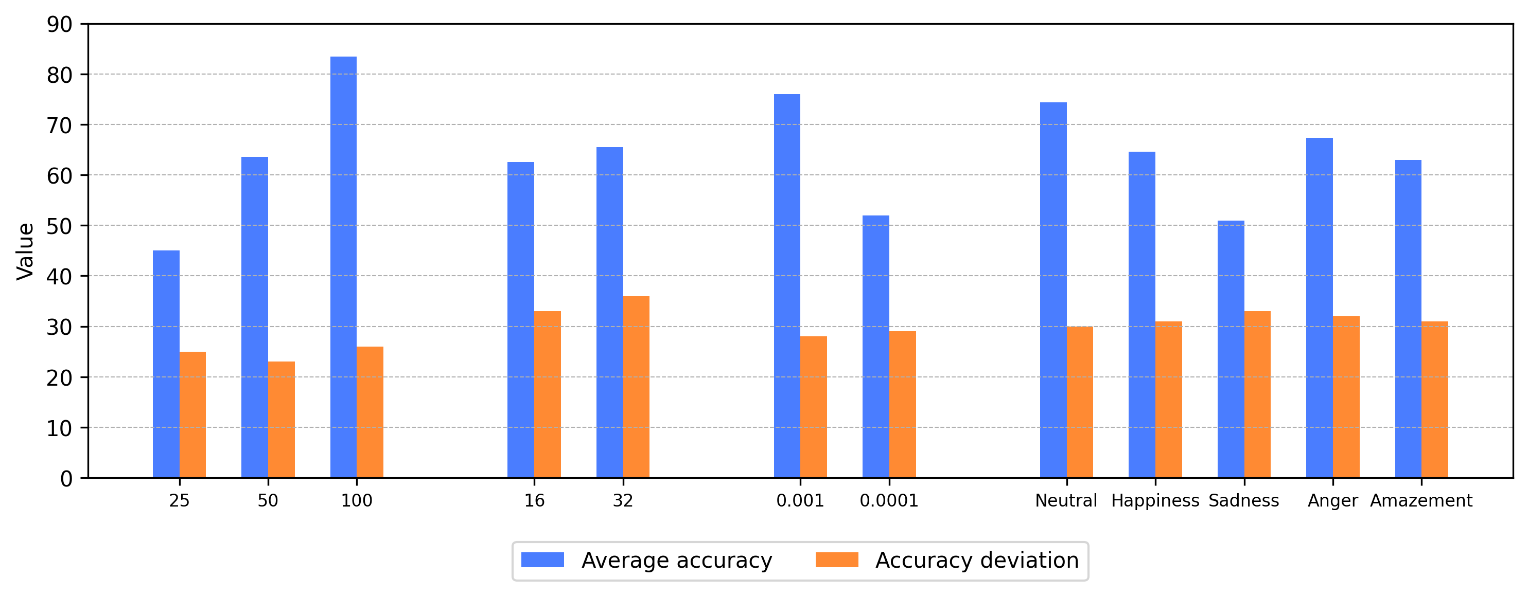 Figure 4 shows that it is advisable to have a greater number of epochs, regardless of the batch size, learning rate and emotion to be identified.