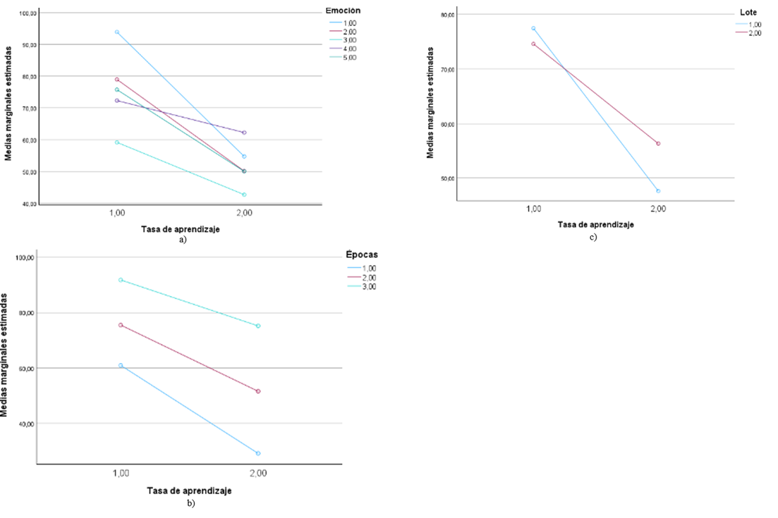 The profile graphs in Figure 3 show the variations in the estimated average marginal rates of accuracy with respect to the two learning rate levels (1-0.001 and 2-0.0001). From Figure 3a, for most emotions, it is more convenient to have a higher learning rate, except for anger. Figure 3b shows better results at higher learning rates regardless of the number of epochs selected. In this case, the results confirm that it is preferable to have a greater number of epochs in the AI model. Figure 3c shows that the best scenario occurs when the learning rate is higher.