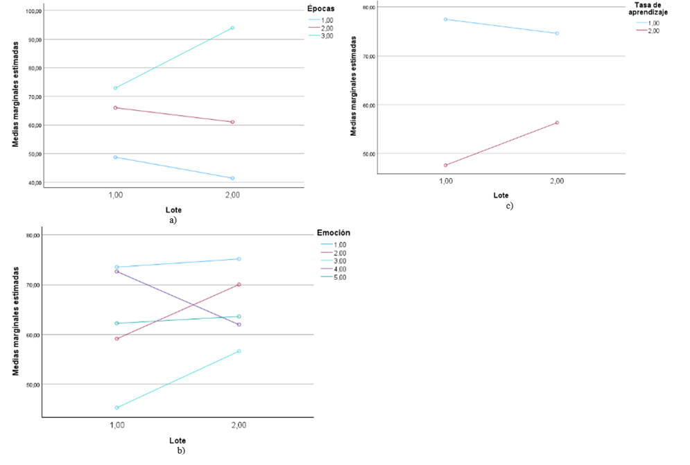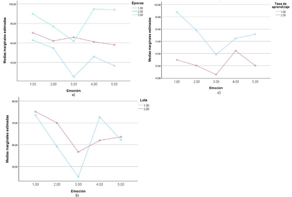 The total number of combinations corresponds to the multiplication of the number of levels of each factor, 60 in each run. The experiment is run 12 times for each of the combinations, obtaining 720 data points. For this purpose, the website https://teachablemachine.withgoogle.com/ was used, which allows the creation of supervised learning models, in this case for the recognition of 5 emotions through facial expressions, varying the values of the factors: Number of epochs, Batch size, and Learning rate. The dependent variable selected is the percentage of accuracy of each learning model in identifying each of the emotions studied, measured on a scale from 0 to 100. The results were tabulated, descriptive statistics were calculated, and they were analyzed using a four-way Analysis of Variance (ANOVA) with a complete design using SPSS software with a significance level of 0.05, which allows conclusions to be drawn in this regard.