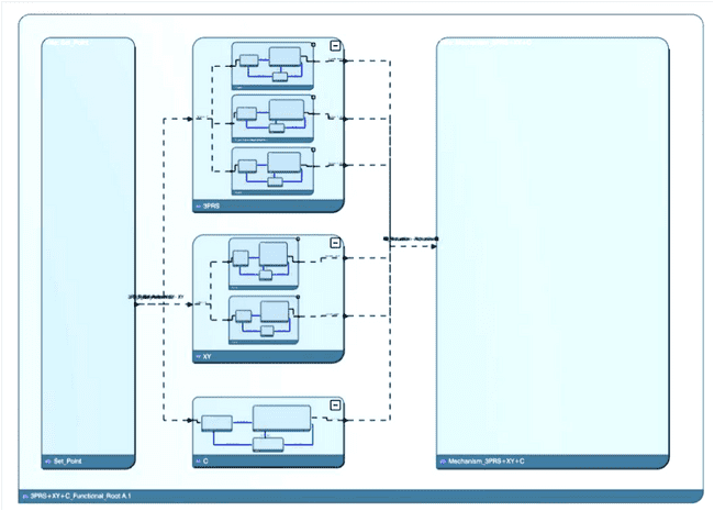 The system model was made of blocks. Each one contains the corresponding structure for the system to work based on the requirements and the analysis previously carried out. This model is included in the block "3PRS+XY+C_Logical_Root". The modelling tool used is the Modelica Software.
