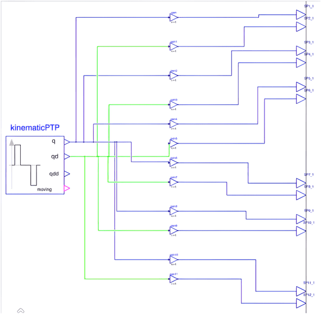 The Set_Point block was modelled, establishing the drive through the passive joints of the 3PRS system. Here it is set the desired position and velocity for each degree of freedom. The position and velocity values are delivered by the "kinematicPTP" block using a matrix arrangement. Figure 11 shows the block diagram that emits the twelve operation signals.