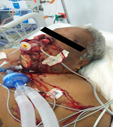 Al 6 día de hospitalización, el paciente se encuentra Hemodinámicamente estable, con bajas dosis de vasopresor, función renal conservada, sin cobertura antibiótica, afebril. Bajo ventilación mecánica invasiva, llama la atención el gran tamaño de su lengua (macroglosia). Se coloca en posición prono al tiempo que presenta sangrado en gran cantidad al comprimirse la dentadura inferior contra la cara inferior de la lengua, lesionando las venas raninas y arteria lingual derecha. Por lo cual, el paciente es trasladado al área de quirófano.