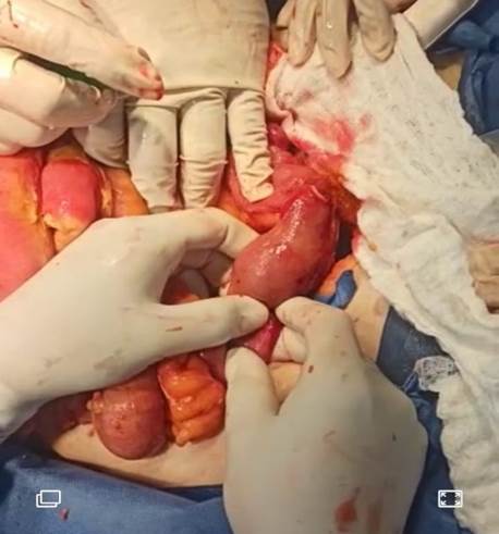 Se realiza. Colecistectomía abierta de forma anterógrada y reparación de perforación, rafia duodenal, previo desbridamiento de bordes, en dos planos; se realizó enterotomía con extracción de cálculo y cierre de la misma en dos planos. Ilustración 3,4,5.