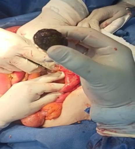 Entre los hallazgos tenemos; dilatación de asas intestinal con edema, cálculo de 2.5 cms de grosor en el interior de íleon terminal 5 cms de la válvula ileocecal, vesícula dura con paredes engrosadas y muy adherida al duodeno que al realizar la adherolisis se observa una comunicación entre la vesícula y el duodeno (fistula colecisto duodenal).