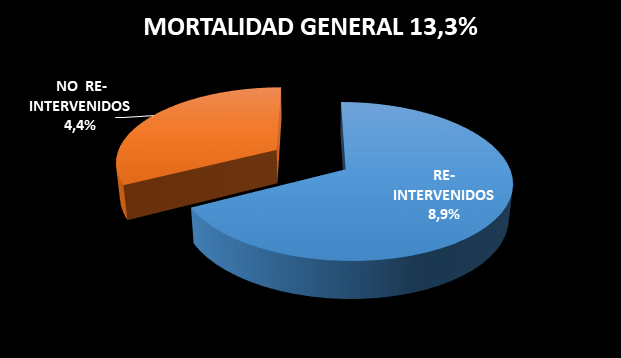 La mortalidad general fue de 13,3%, fueron reintervenidos el 8,7% de los pacientes y no fueron reintervenidos el 4,3%.