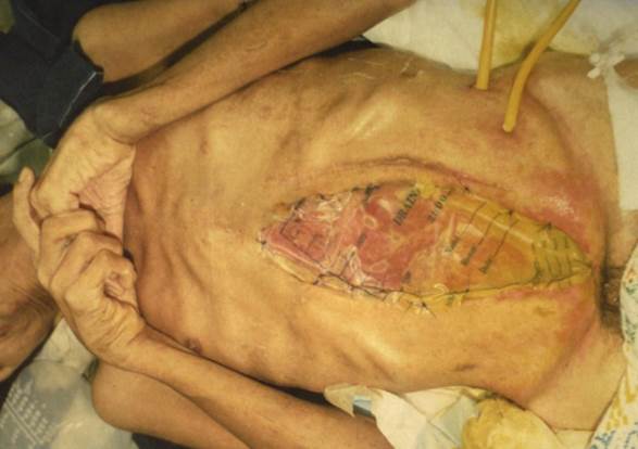 Figura 2 Fistulas entero-atmosférica (flechas), destrucción de tejidos y quemadura local.