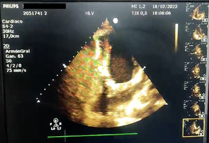 Aproximadamente 3 Semanas posterior al alta presenta cuadro de insuficiencia respiratoria asociado a insuficiencia cardiaca descompensada por lo que acude a nuestro Hospital de Especialidades Abel Gilbert Pontón siendo internada en Unidad Coronaria, a su ingreso se evidencia dolor precordial y torácico bilateral que irradia a región dorsal acompañado de disnea clase funcional NYHA IV/IV, tos persistente y edema leve de miembros inferiores, los laboratorios realizados evidencian anemia leve con hb 10.8 g/dL, péptido natriurético elevado de 12895 pg/ml, enzimas cardiacas negativas, hematuria y proteinuria en uroanálisis; en la radiografía de tórax se muestra cardiomegalia y derrame pleural bilateral; En electrocardiograma taquicardia sinusal, dextrorrotación, complejo QS en cara inferior, sin alteraciones de la onda T y segmento ST. En eco de pleura muestra derrame pleural derecho de moderada a gran cuantía y derrame pleural izquierdo moderado, sospechando de colagenopatía vs enfermedad autoinmune a descartar. Se realiza ecocardiograma transtorácico se evidencia formación aneurismática del VI de 9.5cm x 9.7cm tapizado por trombos con pérdida de la continuidad a nivel perimembranoso septal, además de una miocardiopatía dilatada con FEVI (fracción de eyección del ventrículo izquierdo) 28%. El estudio de líquido pericárdico da como resultado exudado con relación líquido/sérica de LDH 1,8 y proteína 0,7. En ecocardiograma transesofágico (Ilustración 1,2,3) se confirma pseudoaneurisma de gran tamaño del VI en región basal posterior con flujo bidireccional de 10 cm x 7,22cm tapizado de formación trombótica con pérdida de la continuidad de la región basal y posterior del VI con hipocinesia global e hipertensión pulmonar leve con insuficiencia mitral y tricuspidea leve por lo que se decide resolución quirúrgica.