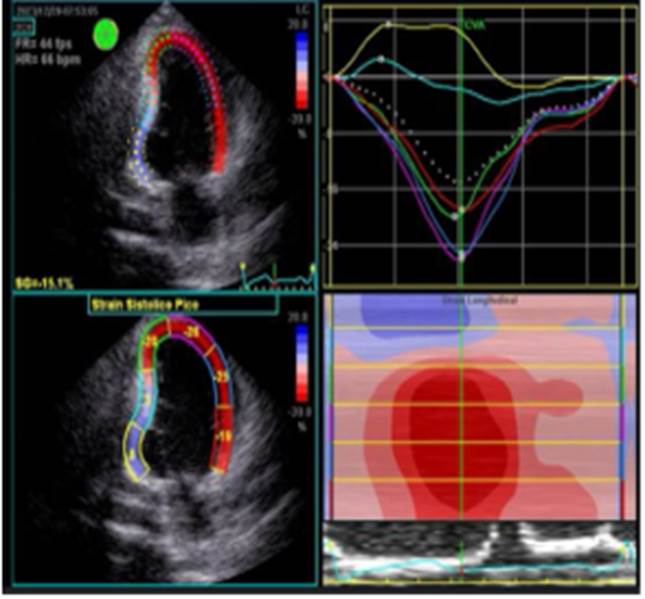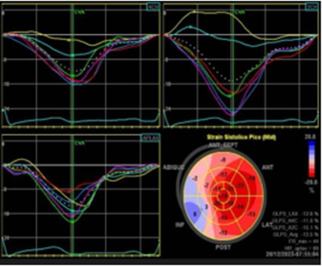 Posterior al alta se realizan controles por consulta externa en nuestro hospital, paciente con mejoría clínica marcada que se evidencia en la tolerancia al decúbito dorsal presentando además cambios beneficiosos en su clase funcional de la NYHA I/IV, en su FEVI al doble en comparación a la FEVI inicial, se mantiene medicación ambulatoria para insuficiencia cardiaca. El control ecocardiográfico 3 meses posteriores al evento muestra trastornos de motilidad en cara inferior con un strain sistólico pico GLPS: -13.5%, mejoría de la FEVI del 44% ilustación 8 y Fig 9, ya no se visualiza Pseudo Aneurisma del septum interventricular persistiendo una pequeña alteración morfológica de la pared inferior del VI que se confirma con la deformidad pico longitudinal disminuida a predominio de la pared inferior basal.