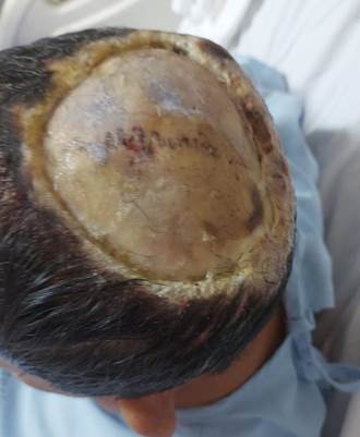 Se realizó la recepción del paciente en área de emergencia con un diagnóstico de quemaduras electrica del 3,5 % de superficie corporal quemada en área coronal (Foto1) y es reportado de cuidado crítico. La cabeza fue la puerta de entrada y salida de la electricidad a nivel del cuero cabelludo en área coronal, no encontrándose ningúna otra lesión en el cuerpo. Durante su estadía hospitalaria recibió el tratamiento médico quirúrgico correspondiente, entre ellos fluidoterapia según Fórmula de Parkland, antibioticoterapia y analgésicos. Se realizaron exámenes complementarios necesarios para ser intervenido quirúrgicamente con resultados normales, debridamiento de tejido necrótico en cuero cabelludo (Foto2,3) y exceresis de tabla ósea biparietal (Foto4) dejando área medial fresada (Foto4) para luego colocar injertos de piel (Foto5,6), quedando de esta manera resolver el defecto de tejido a nivel de cuero cabelludo con expansores tisulares, que sería la opción ideal y desde el punto de vista estético fuera agradable para el paciente; sin embargo, el paciente decidió no realizar esta última opción. Resultado final solo con cobertura de injerto de piel sobre meninges biparietal y área coronal sagital (Foto7).