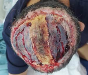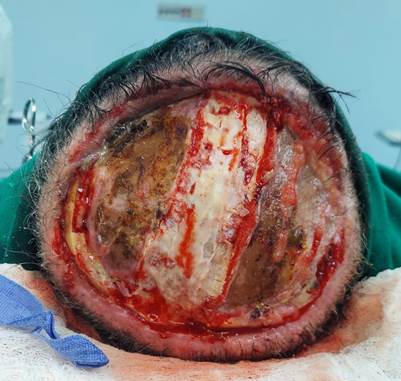 Ilustración 3 Desbridamiento de tejido necrótico en cuero cabelludo.