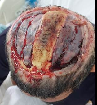 De esta manera, logró el cierre de todo el defecto quedando pendiente la cobertura final con expansión de colgajo en cuero cabelludo, pero con la negativa de este último procedimiento por parte del paciente, no logrando un resultado estético agradable para el paciente.
