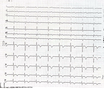En el primer electrocardiograma tomado al ingreso muestra: ritmo sinusal, FC 70 lpm, PR 160ms, QRS 100 ms, q en DIII, avF, segmento ST isoeléctrico, onda T negativa simétricas V2- V6, QTc 400 ms. (Ilustración 1).