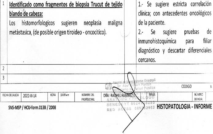 Se toma biopsia con aguja gruesa de lesión tumoral cervical y tumoración occipital encontrando carcinoma papilar variante oncocitica.  Paciente fue tratada por el departamento de oncología clínica en forma paliativa y con Sorafenib por no haber mejoría con radio-yodo.