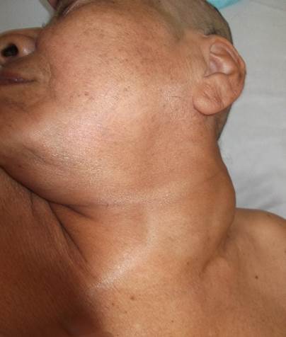 Paciente de 68 años de edad, que ingresa referida de otra institución por presentar más tumoral en región occipital derecha de gran tamaño dura muy adherida, dolorosa con circulación colateral; paciente desorientada en tiempo y espacio, irritable y poco colaborativa, en algunas ocasiones ha presentado convulsiones tónico clónicas. Además, presenta masa cervical voluminosa, a nivel tiroidea, dura, adherida a estructura aéreas y vasculares.