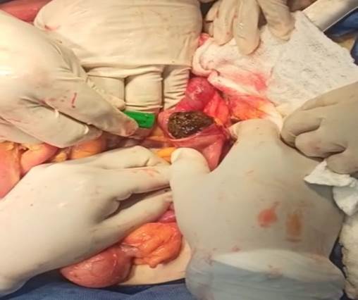 Se realiza. Colecistectomía abierta de forma anterógrada y reparación de perforación, rafia duodenal, previo desbridamiento de bordes, en dos planos; se realizó enterotomía con extracción de cálculo y cierre de la misma en dos planos. Ilustración 3,4,5.
