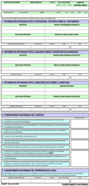 Se aplicará en procedimientos diagnósticos, terapéuticos o preventivos, luego de que el profesional de la salud explique al paciente en que consiste el procedimiento, los riesgos, sus beneficios, alternativas a la intervención y las posibles consecuencias derivadas si no se interviene. Cuando se trate de un procedimiento de salud de riesgo mayor, el consentimiento deberá ser expresado de manera escrita, ya sea por el paciente o por su representante legal en caso de que éste no pueda. Este formulario firmado pasará a ser parte de la historia clínica.