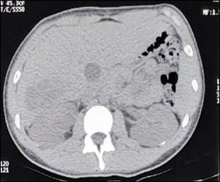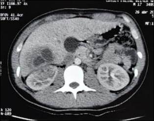 Al tercer día del tratamiento médico, presentó fiebre persistente que no cedía con antipiréticos, con presencia de aumento de leucocitosis (Glóbulos blancos 17 mil/mm3) a predominio de neutrófilos 92%, recabándose resultados de los cultivos periféricos: urocultivo negativo y hemocultivos periféricos con rescate de Pantoea sp. con resistencia probable a las betalactamasas, por lo cual se decide rotar antibiótico a imipenem y se solicitó nueva urotomografía simple y contraste endovenoso evidenciándose absceso renal e imagen abscedada en segmento VI hepático. (Figura 2)