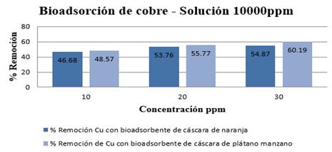 3.3. Bioadsorción de cobre con el polvo de cáscara de naranja y plátano manzano