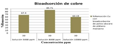 En la figura 5 en la evaluación de remoción de cobre utilizando 3 diferentes soluciones patrón de 5000 ppm, 8000 ppm y 10000 ppm con la alícuota de 30 ppm de cada una de ellas con el bioadsorbente cáscara de plátano manzano, se determinó que con la solución de 8000 mg/l ofrece mayor remoción alcanzando un porcentaje de remoción 85,71%.