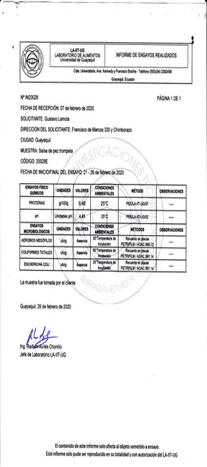 Se envió una muestra al laboratorio, tomando como referencia la cantidad de 150 ml de salsa de pez trompeta, con el fin de realizar exámenes microbiológicos para verificar la cantidad de proteína, pH, ensayos microbiológicos (gérmenes aerobios, coliformes totales, escherichia coli) humedad, cenizas, carbohidratos y energía, por la cual de la certificación de que el producto cumple con todas las normas de calidad y está apto para el consumo humano.