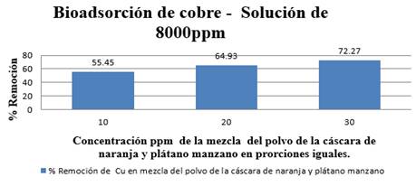 En la figura, se observa los resultados obtenidos a partir de la solución patrón de 8000 ppm, siendo ésta la concentración óptima que presentó mayor porcentaje de remoción trabajando con los bioadsorbentes por separado. Razón por la cual a partir de dicha concentración se prepararon soluciones de igual proporción con ambos bioadsorbente, obteniéndose la mayor remoción con 30ppm tomando una alícuota de 15ppm de cada bioadsorbente, alcanzando un porcentaje de remoción del 72,27 %.