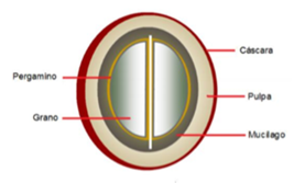 El cafeto es un arbusto frondoso del género Coffea, de la familia de las Rubiáceas. Prospera en climas tropicales y subtropicales ecuatoriales. Su composición es un fruto carnoso en forma de cereza que contiene altos porcentajes de alcaloides [22]. Las cáscaras que rodean la semilla, llamadas pergamino, y el mucílago tienen un alto contenido en azúcares y bajo en metilxantinas en comparación con la cereza. La pulpa es la porción más grande y determina las variedades por su estructura química [23].
