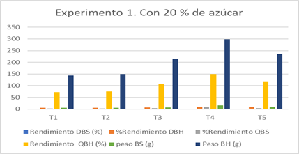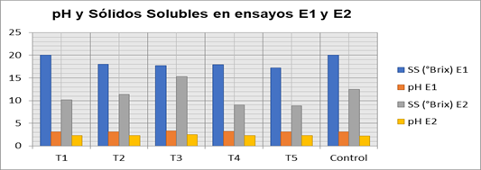 La variación del consumo de sustrato expresado en grados Brix y el nivel de acidez dado en pH por cada experimento presenta diferencia significativa, sin embargo, sus valores se mantienen constantes entre tratamientos. Los valores del pH fluctúan entre los 2 – 2.5, volviendo al medio de cultivo óptimo para el desarrollo del género Acetobacter.