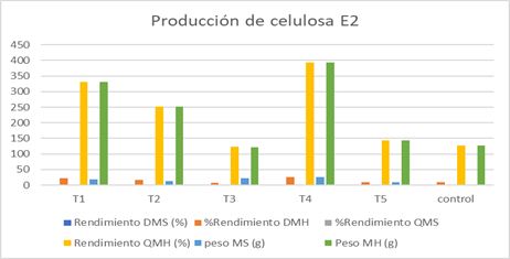 Por otra parte, la ausencia total de éste afecta en el rendimiento de producción de celulosa. Esto fue demostrado en el tratamiento 5 (100 % Cáscara de café), cuyo valor promedio fue el 11 %.