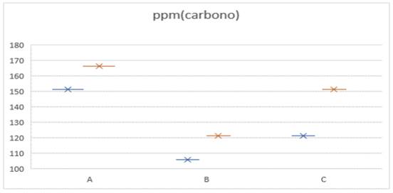 La figura 6 ppm (carbono)representa los valores obtenidos en cada caso: