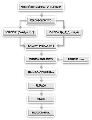 § Se prepararon nanopartículas de Cobre a partir de una solución de sulfato de cobre y ácido ascórbico mediante la utilización de microondas en el que se obtuvo un 48,643% de rendimiento.