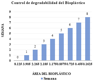 En la figura 8, se muestra el gráfico del control de degradabilidad del bioplástico en el que se puede evidenciar más claramente el aumento en la biodegradación del plástico y la reducción de su tamaño en un 98% en tan solo 8 semanas.