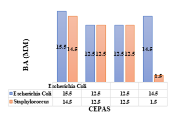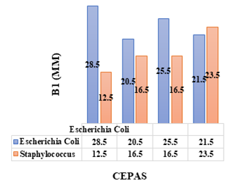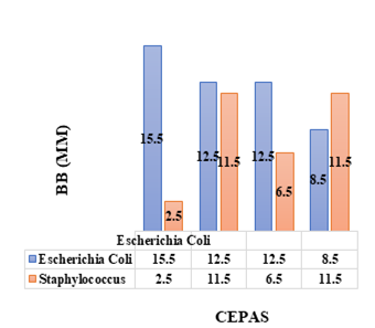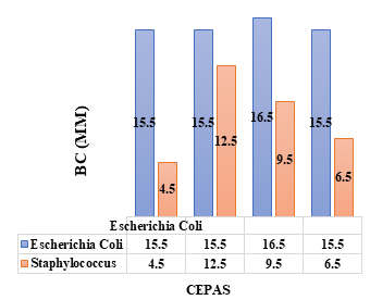 En las figuras 9, 10 y 11 se pueden observar los tamaños de los halos de inhibición de los discos de muestras enriquecidas con NPCu que están siendo comparadas entre las cepas de Escherichia Coli y Staphylococcus; la diferencia en el crecimiento de los halos y la efectividad ejercida en cada una de las bacterias es claramente evidente; el efecto inhibitorio de las nanopartículas de cobre en Escherichia Coli es mayor que en las muestras de Staphylococcus, siendo su máximo valor de 15,5mm y 14,5mm de diámetro respectivamente.