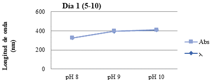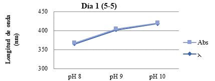 Las (AgNPs) fueron caracterizadas por el espectrofotómetro uv-vis como se muestra en las tablas 5, 6 y 7; los mejores resultados se presentaron en la tabla de pH 10 en día 1 y con proporción v/v, esto es debido a que se detectó la mejor muestra en 418 nm representando el pico más alto con respecto a las gráficas; también gracias al equipo (SEM) se logró visualizar a las (AgNPs) obteniendo una morfología esférica con un tamaño de 10 nm, indicativo que se encuentra dentro del rango nanométrico, considerándose una excelente dimensión necesaria para inhibir en gran cantidad a los agentes patógenos.