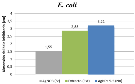 Los resultados obtenidos demuestran que la solución de AgNO3 1mM y el extracto de romero poseen actividad antimicrobiana. Sin embargo, las nanopartículas de plata sintetizadas presentaron una mejor respuesta con respecto a la inhibición.
