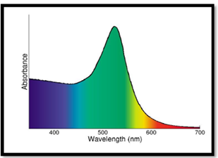 Fig. 6. Espectro de absorción de NPs de diámetro inferior a 30 nm con absorción principal de fotones verdes y azules transmitiendo el color rojo al coloide
