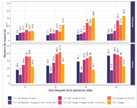 Luego de 40 días, los tratamientos T3, T4 y T5 presentaron las medias más altas en mazorcas sanas, lo que sugiere una persistente efectividad en el control de la enfermedad.