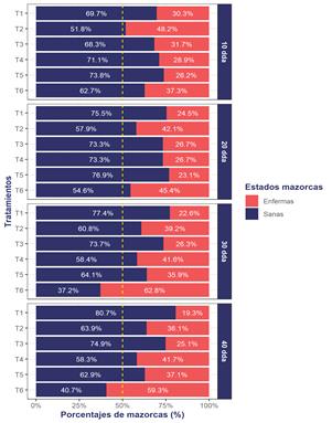 Por el contrario, los tratamientos que tienen una mayor proporción de mazorcas enfermas en cada momento son aquellos con porcentajes más altos en las barras "Enfermas". El tratamiento T6 tiene una proporción de mazorcas enfermas del 37.25% a los 10 días, del 45.44% a los 20 días, del 62.83% a los 30 días y del 59.25% a los 40 días.