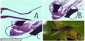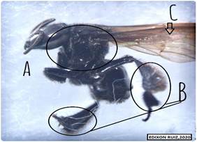 Los adultos presentan coloración castaña a negro (Figura 5A), patas y tarsos de color negro y anchas en forma de hojas (Figura 5B), alas membranosas claras y transparentes con estigmas y venas amarillentas (Figura 5C) no presenta aguijón, lo cual se corrobora con lo publicado por (Medina & Kondo, 2012) quienes manifiestan que ésta especie está presente en Colombia, atacando a frutos de pitahaya.