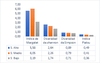 La diversidad utilizando distintos indicadores es variable, según Shannon-Wiener, existe una diversidad media, según la dominancia de Simpson en dos sectores hay diversidad alta con dominancia baja, según el índice de Pielou existe en los tres sectores una diversidad media, ligeramente heterogenia en abundancia.