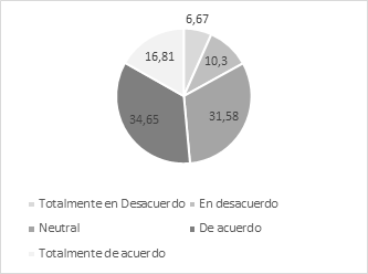 El 34,65% de los encuestados estuvo de acuerdo con que la esterilización impacta positivamente en el comportamiento del canino, seguido del 31.58% que se mantuvieron neutrales, el 16,81% estuvieron totalmente de acuerdo, mientras que un pequeño porcentaje de 10.30% expresó desacuerdo, finalmente el 6,67% de los encuestados estuvieron totalmente en desacuerdo. Los resultados reflejan una percepción predominantemente positiva y neutral respecto al impacto de la esterilización en el comportamiento.