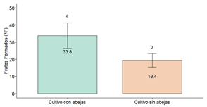 Número de frutos formados: En cuanto a la formación de los frutos se contabilizaron teniendo en cuenta solo los que se formaron en el lapso que estuvo la colmena de abejas en uno de los tratamientos, entre los 47 y 68 días después del trasplante. Se estableció que existe diferencia significativa aun nivel de significancia del 5%. El tratamiento de mejor promedio con 33.8 frutos fue el tratado con abejas a diferencia del tratamiento sin la presencia de la colmena de abejas el cual obtuvo un promedio de 19.4 frutos formados, siendo este último valor un 74% menor que el polinizado por las abejas (Figura 2).