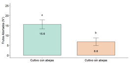 Número de frutos abortados: La variable porciento de frutos abortados fue analizada a partir de los frutos que presentaban malformaciones con relación a los frutos formados. El análisis de varianza demostró estadísticamente diferencia significativa entre los tratamientos. El tratamiento con menor cantidad de frutos abortados fue donde no existía presencia de abejas con un promedio de 6.8, no siendo así en el tratamiento con colmena donde se promediaron 15.6 frutos abortados (Figura 3).
