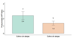 En la variable productividad según los análisis, se pudo observar diferencias significativas con un 95% de nivel de confianza. El tratamiento con abejas obtuvo una media del nivel de productividad de 2.41, resultando un 74% mayor que el tratamiento sin la presencia de la colmena de abejas quien promedió 1.38 de productividad (Figura 4).