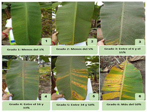 Para (Morocho, 2015), la severidad de Sigatoka se debe determinar haciendo evaluaciones semanales o quincenales, utilizando el método de Stover modificado por Gauhl, el cual estima visualmente el área total afectada de cada hoja de las plantas próximas a floración. Esta escala incluye seis grados que toman en cuenta las hojas presentes, excepto la bandera y las hojas agobiadas. Con dicho método se dará a conocer la situación sanitaria de la plantación, en el cual evaluará los niveles de infección de 10% hasta 50%.