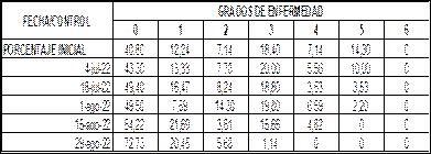 d) Porcentaje de área foliar sana (AFS): Se determinó restando el valor total de los grados (1 a 6) con el valor del grado 0 (sin síntoma de daño).