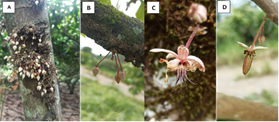 Figura 1. Cojinetes florales (A); flores por cojinetes (B); flores abiertas (C); fruto cuajado (D). Fuente: Google Images.