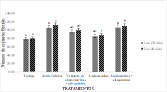 Figura 2. Número de cojinetes florales por efecto de la aplicación de bioestimulantes en el cultivo de cacao clon CCN-51. Letras distintas son estadísticamente diferentes de acuerdo al test de Tukey al 5% de probabilidad.