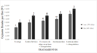 El tratamiento de aminoácidos + citoquininas obtuvo el mejor promedio con un valor de 18 flores por cojinete floral esto coincide con Terralia (2014) en donde indica que los aminoácidos poseen una acción de promover los procesos metabólicos en las fases de brotación, floración, fructificación de los cultivos; además a lo manifestado por Mok (1994) quién indica que las citoquininas se involucran en la división celular, desarrollo de brotes y el antagonismo de la senescencia.